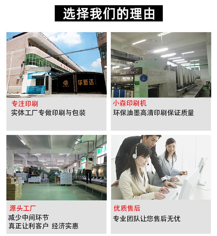 服務(wù)團(tuán)隊(duì):業(yè)務(wù)團(tuán)隊(duì)均由從事五年以紙品印刷經(jīng)驗(yàn)的專業(yè)人員擔(dān)任,采用1對(duì)1全程跟蹤貼心服務(wù)模式,并提供專業(yè)設(shè)計(jì)師配合。線下23年的大牌直供經(jīng)驗(yàn),各類工藝成熟,從定制、印刷、設(shè)計(jì)、售后一條龍服務(wù),以合理的價(jià)格竭誠為廣大客戶提供最優(yōu)質(zhì)的產(chǎn)品和服務(wù)。